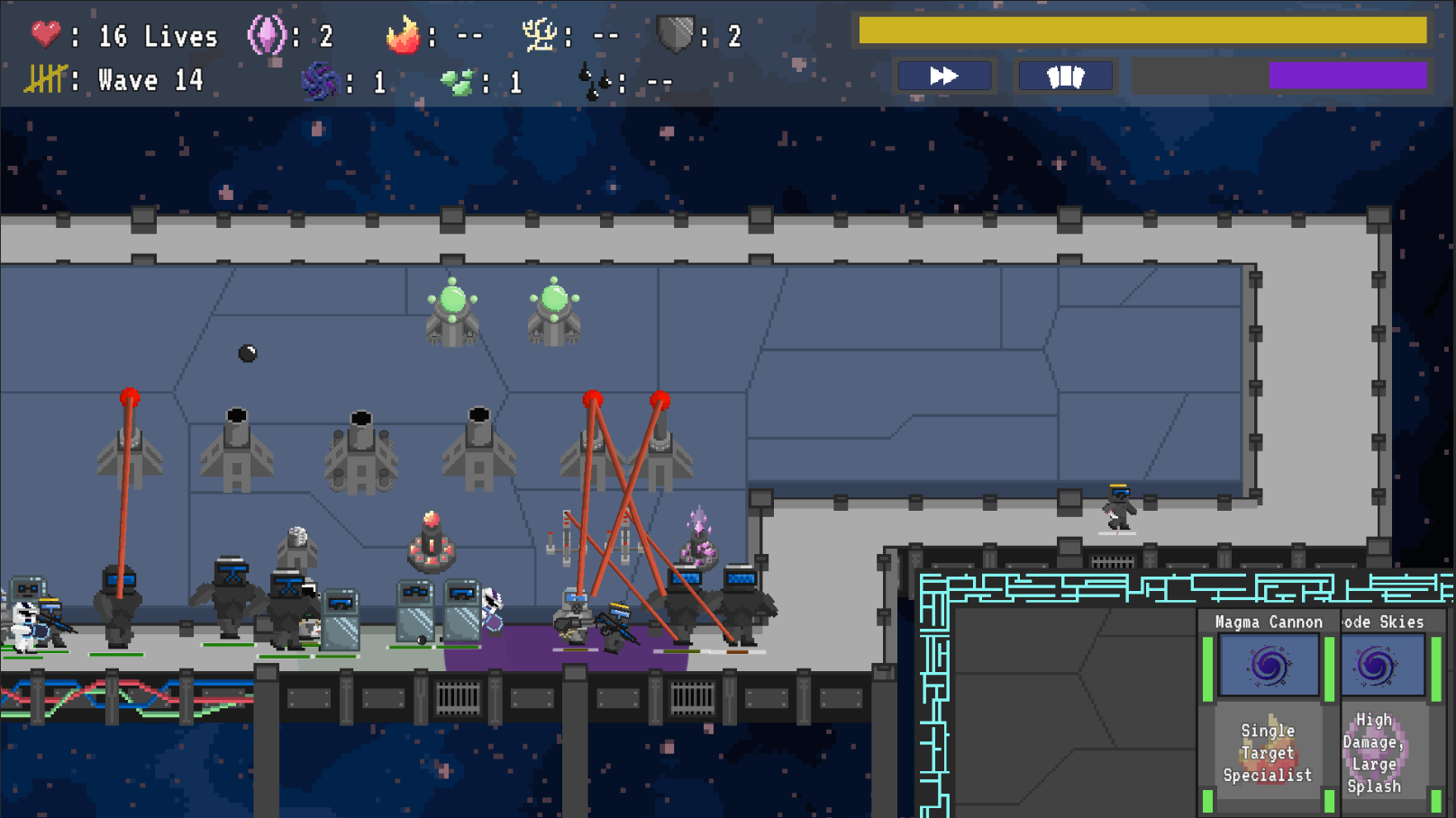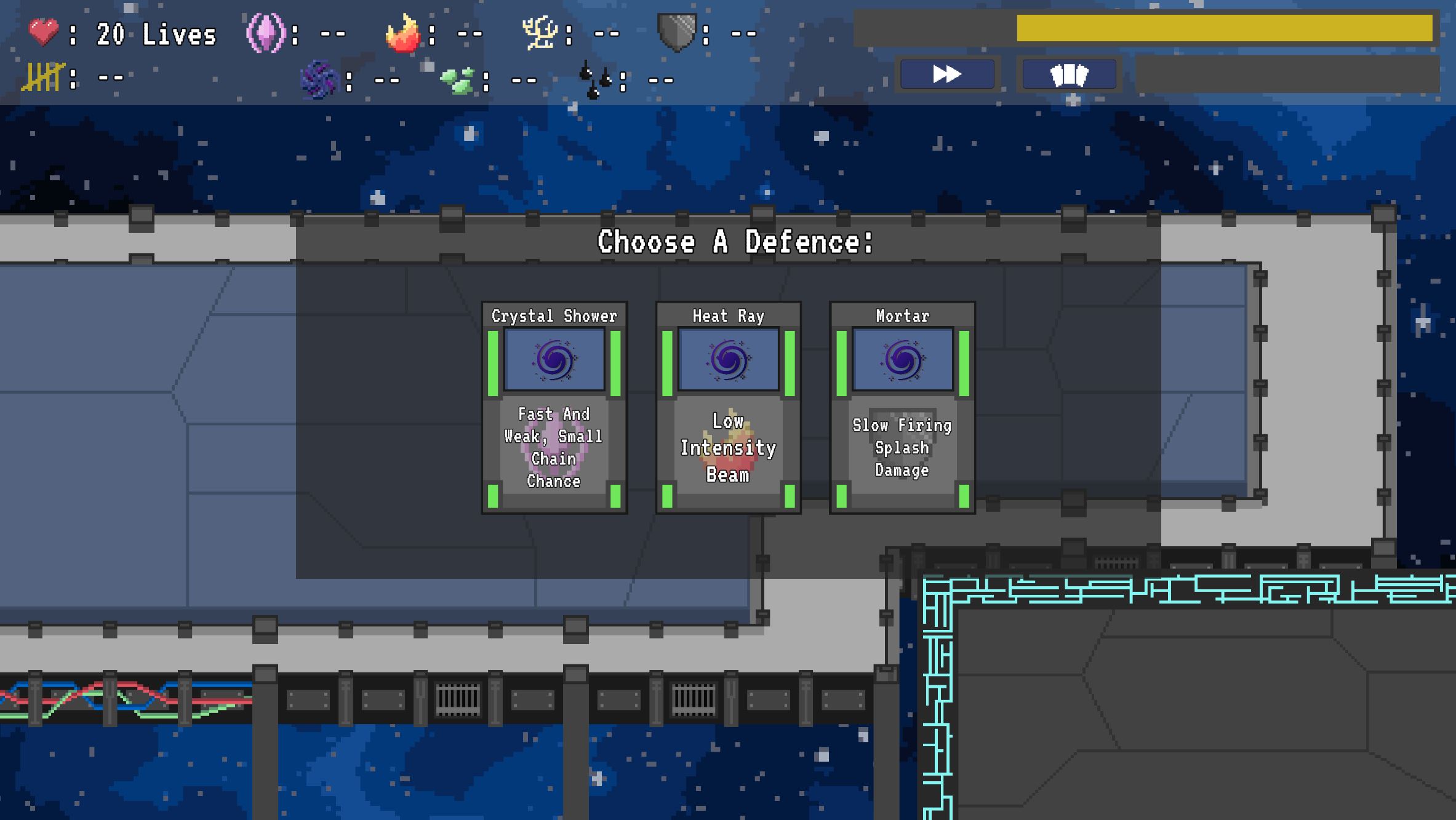 The player must defend the space station from the alien onslaught, using the towers and synergies given by the cards they are dealt, and turning their own chemical weapons against them. Combine strategic tower placement with effective synergy selection to hold out against increasingly difficult waves of aliens. A tower defence with a twist, Chemical Chaos encourages you to use the enemies weapons against themselves, and strategically craft the perfect defence.